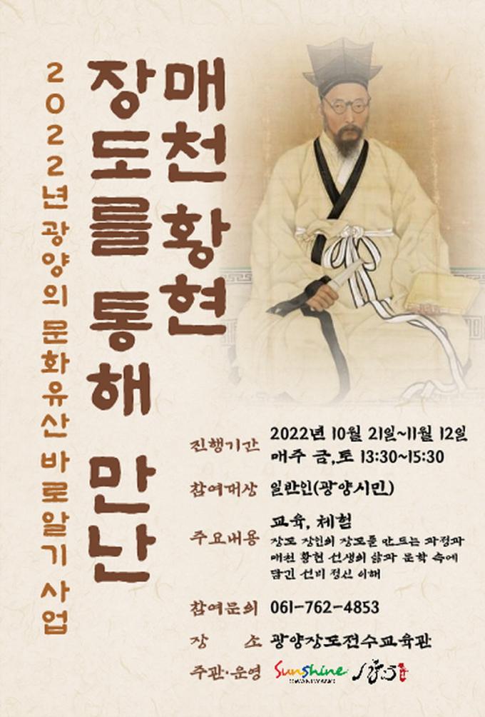 ¹®ÈÀ¯»ê ¹Ù·Î ¾Ë±â »ç¾÷Àº 10¿ù 21ÀÏ~11¿ù 12ÀÏ ¸ÅÁÖ ±Ý¡¤Åä¿äÀÏ ¿ÀÈÄ¿¡ ÁøÇàµÇ¸ç ÇÁ·Î±×·¥¿¡ °üÇÑ ÀÚ¼¼ÇÑ ³»¿ëÀº ±¤¾çÀåµµÀü¼ö±³À°°ü(¢Ï061-762-4853)À¸·Î ¹®ÀÇÇÏ¸é ±¸Ã¼ÀûÀ¸·Î ¾È³»¹ÞÀ» ¼ö ÀÖ´Ù.