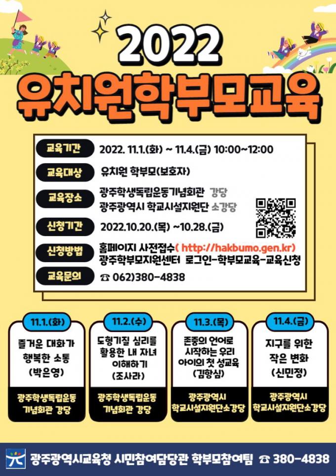 ÇÑÆí ¾ÕÀ¸·Î ÁøÇàµÉ Çкθð±³À° ½Åû ¹× ÀýÂ÷´Â ±¤ÁÖÇкθð±³À°Áö¿ø¼¾ÅÍ ´©¸®Áý (http://hakbumo.gen.go.kr)À» ÅëÇØ È®ÀÎÇÒ ¼ö ÀÖ´Ù. ±âŸ ÀÚ¼¼ÇÑ »çÇ×Àº ½Ã±³À°Ã» ½Ã¹ÎÂü¿©´ã´ç°ü ÇкθðÂü¿©ÆÀ(¢Ï062-380-4836~8)À¸·Î ¹®ÀÇÇÏ¸é µÈ´Ù.
