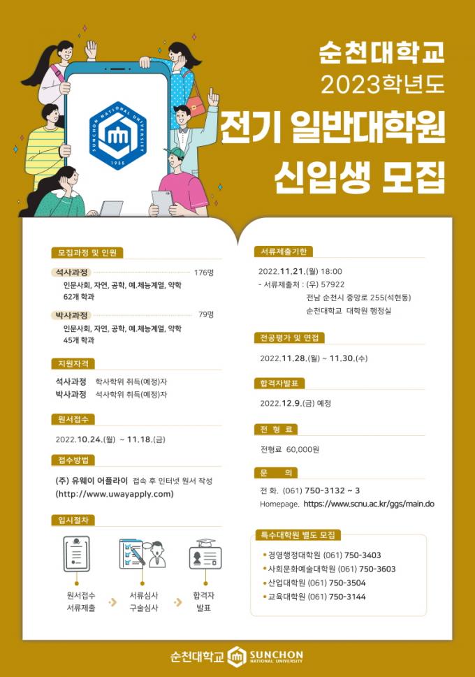 ¿ø¼´Â 10¿ù 24ÀÏ(¿ù)ºÎÅÍ ~ 11¿ù 18ÀÏ(±Ý)±îÁö ¢ßÀ¯¿þÀ̾îÇöóÀÌ¿¡¼ ÀÎÅͳÝÀ¸·Î Á¢¼öÇϸç ÀÚ¼¼ÇÑ »çÇ×Àº ¼øÃµ´ëÇб³ ÀϹݴëÇпø ȨÆäÀÌÁö(https://www.scnu.ac.kr/ggs/main.do)¸¦ ÂüÁ¶ÇÏ¸é µÈ´Ù. Àü°ø Æò°¡ ¹× ¸éÁ¢Àº Çаú/Àü°ø¿¡ µû¶ó 11¿ù 28ÀÏ(¿ù)ºÎÅÍ ~ 11¿ù 30ÀÏ(¼ö)¿¡ ÀÌ·ç¾îÁö¸ç, ÃÖÁ¾ ÇÕ°ÝÀÚ´Â 12¿ù 9ÀÏ(±Ý)¿¡ ¹ßÇ¥ÇÒ ¿¹Á¤ÀÌ´Ù.