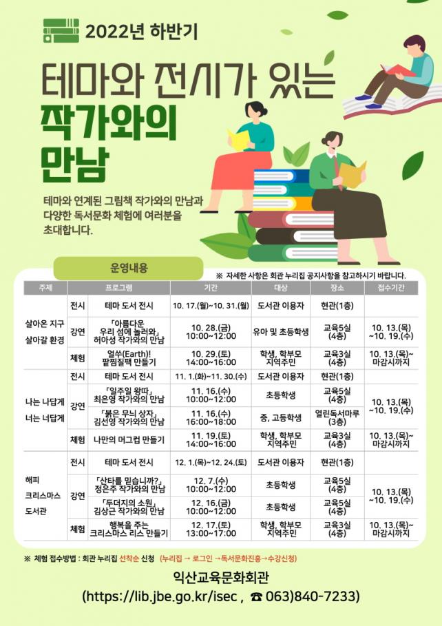 10¿ùÀº ¡®»ì¾Æ¿Â Áö±¸, »ì¾Æ°¥ ȯ°æ¡¯À̶õ ÁÖÁ¦·Î µµ¼ Àü½Ã¸¦ ¿î¿µÇϰí ÀÖÀ¸¸ç, ¿À´Â 28ÀÏ¿¡´Â ¡¸¾Æ¸§´Ù¿î ¿ì¸® ¼¶¿¡ ³î·¯¿Í¡¹ÀÇ ÀúÀÚÀÎ Çã¾Æ¼º ÀÛ°¡¸¦ ÃʺùÇØ ÀÛ°¡¿ÍÀÇ ¸¸³²À» ÁøÇàÇÒ ¿¹Á¤ÀÌ´Ù. ±× ¹Û¿¡µµ ÁÖÁ¦¿Í ¿¬°èµÈ µ¶¼¹®È Çà»ç·Î 29ÀÏ¿¡¡®¾ó¾¥(Eartháú)! ÆÏÂòÁúÆÑ ¸¸µé±â¡¯¸¦ ÅëÇØ ȯ°æÀÇ ¼ÒÁßÇÔÀ» ¾Ë¾Æ°¡´Â ½Ã°£À» ¸¶·ÃÇÑ´Ù.