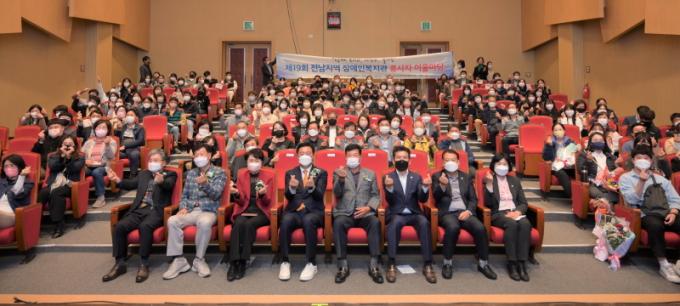 Àü³²µµ¿Í À强±ºÀÌ ÁÖÃÖÇϰí Çѱ¹Àå¾ÖÀκ¹Áö°üÀü³²Çùȸ°¡ ÁÖ°üÇÑ À̹ø Çà»ç´Â Àü³²Áö¿ª 18°³ Àå¾ÖÀκ¹Áö°ü Á¾»çÀÚ 500¿© ¸íÀÌ Âü¼®ÇØ º¹ÁöÁ¤Ã¥ Á¤º¸¸¦ ±³·ùÇϰí ÈÇÕÇÏ´Â ½Ã°£À» º¸³Â´Ù.