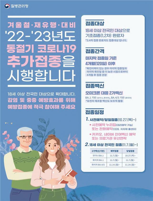 ÇÑÆí, µ¿Àý±â Á¢Á¾Àº ÃÖ±Ù È®ÁøÀÚ ¼ö Áõ°¡ ¹× ½Å±Ô 2°¡ ¹é½Å µµÀÔÀ¸·Î °Ü¿ïö ÀçÀ¯Çà Àû±Ø ´ëºñ¸¦ À§ÇØ 10.11ÀϺÎÅÍ 60¼¼ ÀÌ»ó, ¸é¿ªÀúÇÏÀÚ, °¨¿°Ãë¾à½Ã¼³ µî °Ç°Ãë¾à°èÃþÀ» ¿ì¼±¼øÀ§·Î ½Ç½ÃÇÏ¿´À¸¸ç, ¿À´Ã(10.27)ºÎÅÍ´Â 18¼¼ ÀÌ»ó ¼ºÀÎ ±âÃÊÁ¢Á¾ ÀÌ»ó ¿Ï·áÀÚ·Î È®´ëÇÑ´Ù. ´Ù¸¸, °Ç°Ãë¾à°èÃþ¡¤º¸°ÇÀÇ·áÀο¡°Ô´Â Á¢Á¾À» ±Ç°íÇÑ´Ù. Á¢Á¾¹é½ÅÀº 2°¡¹é½Å 3Á¾(¸ð´õ³ªBA.1, ÈÀÌÀÚBA.1, ÈÀÌÀÚBA.4/5)À¸·Î ¸¶Áö¸· Á¢Á¾ ¶Ç´Â È®ÁøÀÏ ±âÁØ 4°³¿ù ÀÌÈÄ Á¢Á¾À» ±Ç°íÇÑ´Ù. ´Ù¸¸, mRNA ¹é½Å Á¢Á¾ÀÌ °ï¶õÇÑ °æ¿ì, ³ë¹Ù¹é½º¡¤½ºÄ«ÀÌÄÚºñ¿øµµ º¸Á¶ÀûÀ¸·Î Ȱ¿ëÇÑ´Ù.