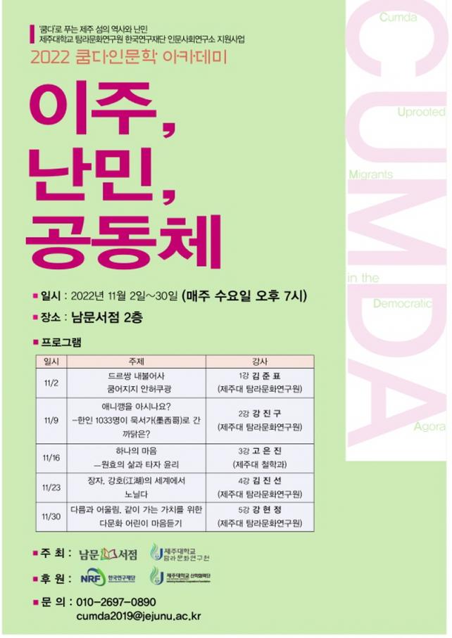 11¿ù 30ÀϱîÁö ÃÑ 5ȸ¿¡ °ÉÃÄ ÁøÇàµÇ´Â °Á¿¡´Â Á¦ÁÖ´ë °»ç¿Í ޶ó¹®È¿¬±¸¿ø Çмú¿¬±¸±³¼ö°¡ °ÀǸ¦ ¸Ã°í ÇöÀå°ÀÇ¿Í ÆäÀ̽ººÏ¶óÀ̺ê(www.facebook.com/cumda2019)¸¦ ÅëÇØ ÁøÇàµÈ´Ù.