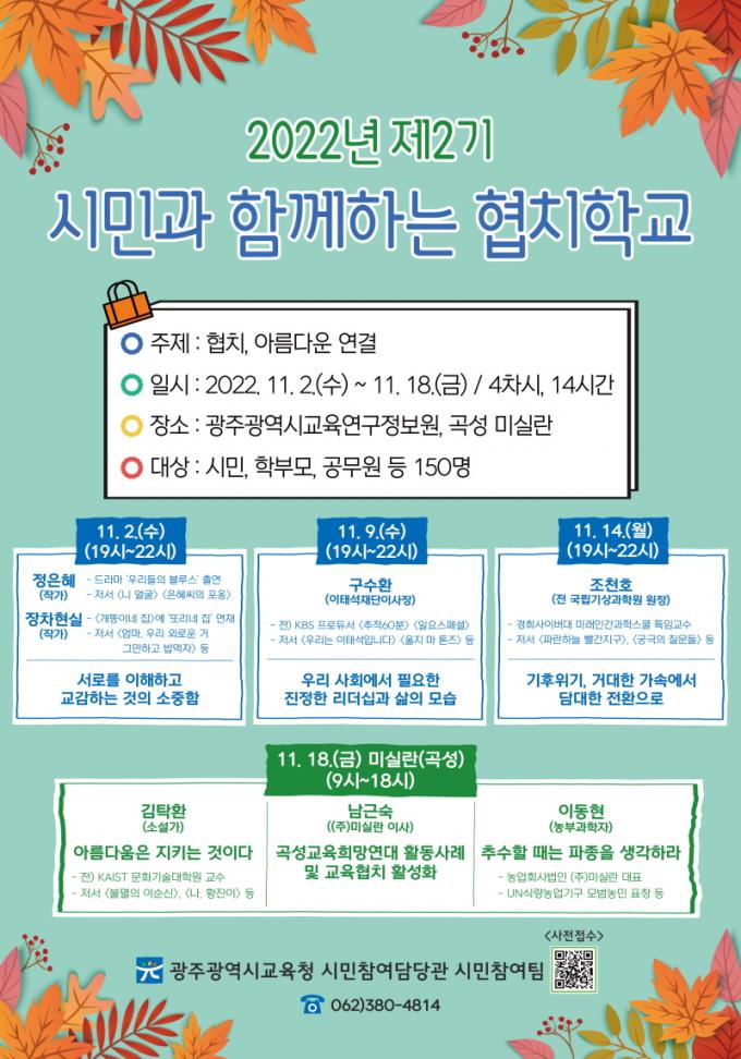 ¡®2022 Á¦2±â ½Ã¹Î°ú ÇÔ²²ÇÏ´Â ÇùÄ¡Çб³¡¯´Â ¡®ÇùÄ¡, ¾Æ¸§´Ù¿î ¿¬°á¡¯À̶ó´Â ÁÖÁ¦·Î ÇùÄ¡¡¤¼ÒÅ롤°ø°¨¡¤±âÈÄȯ°æ µî ´Ù¾çÇÑ ÁÖÁ¦¸¦ ´Ù·ï ±¤ÁÖ±³À°ÀÇ ÇùÄ¡ ¿ª·®À» ³ôÀÏ ¼ö ÀÖµµ·Ï ¸¶·ÃµÆ´Ù.