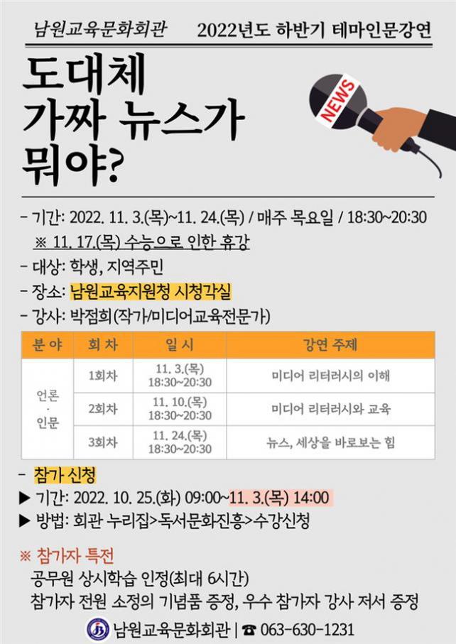 À̹ø °¿¬Àº¡®µµ´ëü °¡Â¥ ´º½º°¡ ¹¹¾ß?¡¯¸¦ ÁÖÁ¦·Î¡¸¹Ìµð¾î ¸®ÅÍ·¯½Ã, ±³À°°ú ¸¸³ª´Ù¡¹ÀÇ ÀúÀÚÀÌÀÚ ¢ßÇѱ¹¹Ìµð¾î¸®ÅÍ·¯½Ã±³À°Çùȸ ´ëÇ¥ÀÌ»çÀÎ ¹ÚÁ¡Èñ ÀÛ°¡¸¦ ÃʺùÇØ ¹Ìµð¾î ¸®ÅÍ·¯½Ã ±³À°À» 3ÀϺÎÅÍ ¿À´Â 24ÀϱîÁö ¸ÅÁÖ ¸ñ¿äÀÏ ¿ÀÈÄ 6½Ã30ºÐ¿¡¼ 8½Ã30ºÐ±îÁö ÃÑ 3ȸ¿¡ °ÉÃÄ ³²¿ø±³À°Áö¿øÃ» ½Ãû°¢½Ç¿¡¼ ÁøÇàÇÒ ¿¹Á¤ÀÌ´Ù.