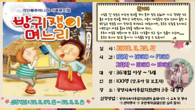 °¡Á· ¹ÂÁöÄà °ø¿¬Àº ¿À´Â 29~30ÀÏ ¼¾ÅÍ ³» ´ë°´ç¿¡¼ Áö¿ª ³» 36°³¿ù ÀÌ»ó ¸¸ 5¼¼ ÀÌÇÏ ¿µÀ¯¾Æ¿Í º¸È£ÀÚ¸¦ ´ë»óÀ¸·Î ÃÑ 4ȸ¿¡ °ÉÃÄ ÁøÇàµÈ´Ù. °ø¿¬Àº °ü¶÷ ¾ÆÀ̵éÀÇ ³ªÀ̸¦ °í·ÁÇØ, °íÀüµ¿È¸¦ ¹ÙÅÁÀ¸·Î °¢»öµÈ ¿ä¼Ò°¡ ´õÇØÁø °¡Á·Çü ¹ÂÁöÄÃÀÌ´Ù.