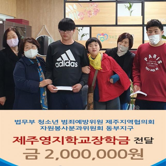 [½Ã»çÁ¾ÇսŹ® = °í¼º¹Î ±âÀÚ] Á¦ÁÖ¿µÁöÇб³(±³Àå ¾çº¹¸¸)´Â 10¿ù 28ÀÏ ±³Àå½Ç¿¡¼ ¹ý¹«ºÎ û¼Ò³â¹üÁË¿¹¹æÀ§¿ø Á¦ÁÖÁö¿ªÇùÀÇȸ ÀÚ¿øºÀ»çºÐ°úÀ§¿øÈ¸ µ¿ºÎÁö±¸(ȸÀå ¹éÈñ¼ø)·ÎºÎÅÍ ÀåÇÐÁõ¼ ¹× ÀåÇÐ±Ý 200¸¸¿øÀ» º»±³ Çлý Áß ¸ð¹üÀûÀÌ°í ±Ù¸éÇÑ Çлý 4¸í¿¡°Ô Á÷Á¢ Àü´ÞÇÏ¿´´Ù.