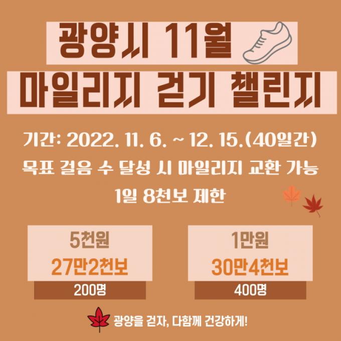 À̹ø 縰Áö´Â ¸ñÇ¥¸¦ 2´Ü°è·Î ¼³Á¤ÇßÀ¸¸ç 27¸¸ 2õ º¸ ´Þ¼ºÀº 5õ ¿ø±Ç, 30¸¸ 4õ º¸ ´Þ¼ºÀº 1¸¸ ¿ø±Ç µî 600¸í¿¡°Ô Áö±ÞÇÑ´Ù. ±¤¾ç½Ã¹ÎÀ̶ó¸é ´©±¸³ª Âü¿©ÇÒ ¼ö ÀÖÀ¸¸ç, Âü¿©¹æ¹ýÀº ¸ð¹ÙÀÏ °È±â ¾Û ¿öÅ©¿ÂÀ» ¼³Ä¡ÇÏ°í ±¤¾ç½Ã °ø½Ä Ä¿¹Â´ÏƼ¿¡ °¡ÀÔÇØ 縰Áö ÅÇ¿¡¼ ±¤¾ç½Ã °È±â 縰Áö ¡®Âü¿©Çϱ⡯¸¦ ´©¸¥ ÈÄ ¸ñÇ¥ ¸¶Àϸ®Áö°¡ ½×ÀÏ ¶§±îÁö ½º¸¶Æ®ÆùÀ» ¼ÒÁöÇÏ°í °ÉÀ¸¸é µÈ´Ù. ´Ü, ±¤¾ç Áö¿ª Á¦ÇÑ ¼³Á¤À¸·Î 縰Áö Âü¿© ½Ã¿¡ ¹Ýµå½Ã ÈÞ´ëÆù À§Ä¡¼³Á¤À» ÄÑ¾ß Âü¿©ÇÒ ¼ö ÀÖÀ¸¸ç, ÀÚ¼¼ÇÑ »çÇ×Àº ±¤¾ç½Ãº¸°Ç¼Ò(¢Ï061-797-3797)·Î ¹®ÀÇÇÏ¸é ¾Ë ¼ö ÀÖ´Ù.