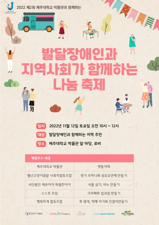 À̹ø Çà»ç´Â ¹ß´ÞÀå¾ÖÀÎÀÌ Áö¿ª»çȸ¿Í ÇÔ²²ÇÏ´Â ÇູÇÑ »îÀ» ÀÀ¿øÇϱâ À§ÇØ Á¦ÁÖ´ë¹Ú¹°°ü°ú ¹ß´ÞÀå¾ÖÀÎ ´Üü°¡ Çù·ÂÇØ ÃßÁøµÆ´Ù. Çà»ç´Â º°³°í¾çÀ̲޹ç»çȸÀûÇùµ¿Á¶ÇÕ, (»ç)Á¦ÁÖ¾ÆÀÌÆ¯º°ÇѾÆÀÌ, ½º½º·Î¸ðÀÓ(°íµî,¼ºÀÎ Àå¾Ö ´ç»çÀÚ¿Í ºÎ¸ð¸ðÀÓ), ÇູÇϰÔÇùµ¿Á¶ÇÕ(¹ß´ÞÀå¾ÖÀÎ °¡Á· ¹®È±âȹ´Ü) µî ¹ß´ÞÀå¾ÖÀÎ °¡Á· ´Üü°¡ ÇÔ²² ÇÑ´Ù.
