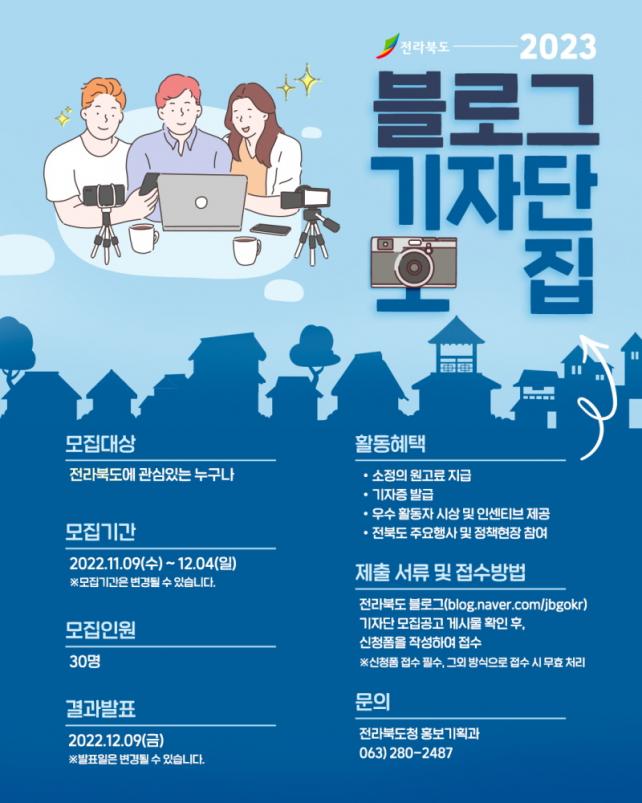 Àü¶óºÏµµ´Â µµÀÇ °ø½Ä ºí·Î±× ¡®ÀüºÏÀÇ Àç¹ß°ß¡¯À» À̲ø¾î°¥ 2023³âµµ ºí·Î±× ±âÀÚ´ÜÀ» 9ÀϺÎÅÍ ¸ðÁýÇÑ´Ù°í ¹àÇû´Ù. ÀüºÏÀÇ ¼ö·ÁÇÑ ÀÚ¿¬È¯°æ°ú Áö¿ª °÷°÷ÀÇ °ü±¤¸í¼Ò´Â ¹°·Ð ÀüºÏÀÌ °¡Áø ¸À°ú ¸ÚÀ» ¼¼°è¿Í Àü±¹¿¡ ÀüÇÒ ºí·Î±× ±âÀÚ´ÜÀº, Àü¶óºÏµµ¿Í È«º¸¿¡ °ü½É ÀÖ´Â ±¹¹ÎÀÌ¸é ´©±¸³ª Áö¿øÀÌ °¡´ÉÇÏ´Ù.
