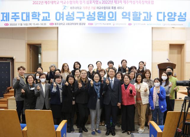 ¹Î¹«¼÷ Á¦ÁÖ¿©¼º°¡Á·¿¬±¸¿øÀåÀº ¡°Á¦ÁÖ´ë °³±³ 70ÁÖ³âÀ» ÃàÇÏÇÏ°í ´ëÇаú Áö¿ª»çȸ ¼ºÆòµî ¹®È Á¤ÂøÀ» À§ÇØ ³ë·ÂÇØ ¿Â ¿©±³¼öÇùÀÇȸ¿¡ °¨»çµå¸®°í ´ëÇлçȸ¸¦ ºñ·ÔÇÑ ¿ì¸® »çȸÀÇ Æòµî°ú °øÁ¸¿¡ ´ëÇÑ °¡Ä¡¸¦ °øÀ¯Çϰí È®»êÇÏ´Â ÀÇ¹Ì ÀÖ´Â ½Ã°£µÆ´Ù¡±°í ¸»Çß´Ù.