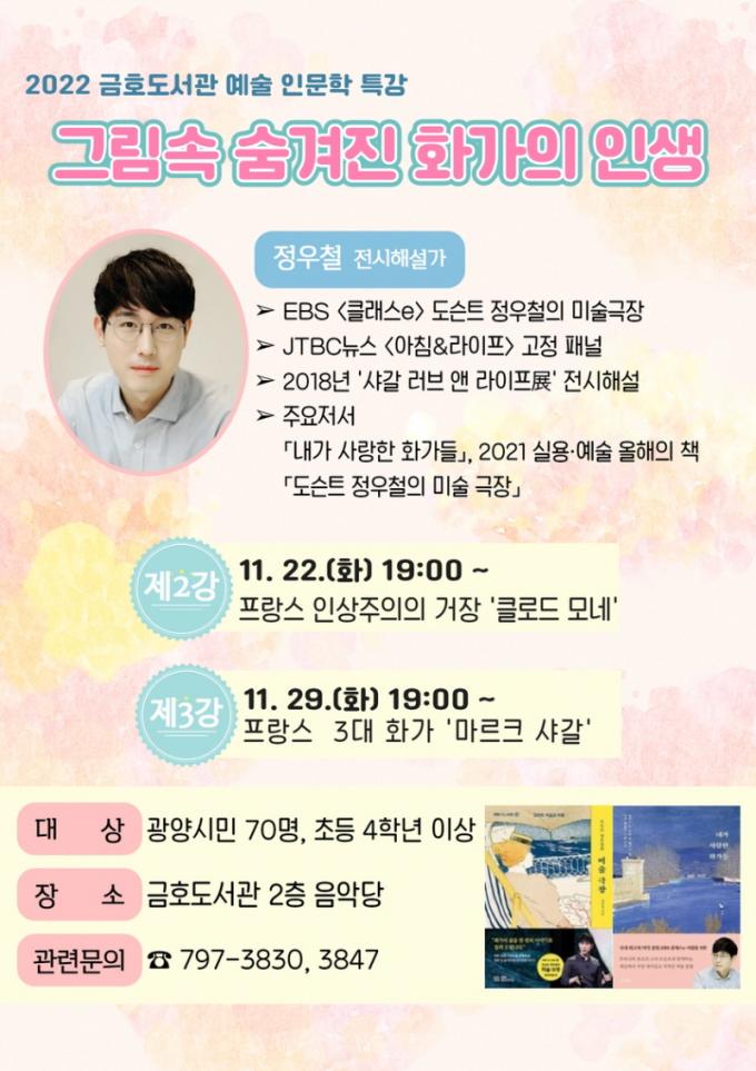 ¡®±×¸² ¼Ó Ȱ¡ÀÇ Àλý¡¯ °Á¿¡ ´ëÇØ ±Ã±ÝÇÑ »çÇ×Àº ±¤¾ç½Ã¸³µµ¼°ü ȨÆäÀÌÁö(lib.gwangyang.go.kr)¸¦ Âü°íÇϰųª ±¤¾ç±ÝÈ£µµ¼°ü(¢Ï061-797-3847)À¸·Î ¹®ÀÇÇϸé ÀÚ¼¼È÷ ¾È³»¹ÞÀ» ¼ö ÀÖ´Ù.