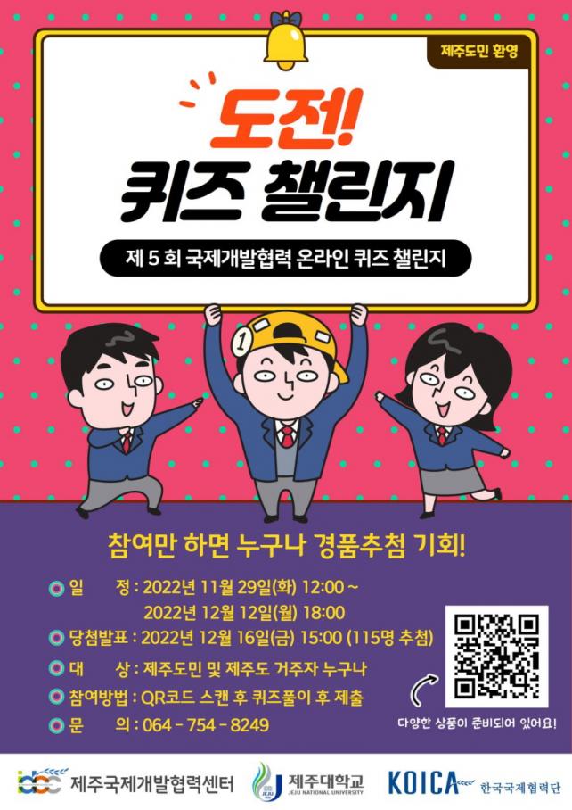 ±¹Á¦°³¹ßÇù·Â ºÐ¾ß¸¦ ºñ·ÔÇØ ´Ù¾çÇÑ ±¹Á¦ À̽´¿¡ °ü½ÉÀÌ ÀÖ´Â Á¦ÁÖµµ¹Î°ú Á¦ÁÖµµ °ÅÁÖÀÚ ´©±¸³ª Âü¿©ÇÒ ¼ö ÀÖ´Ù. Âü¿© ¹æ¹ýÀº Á¦ÁÖ±¹Á¦°³¹ßÇù·Â¼¾ÅÍ È¨ÆäÀÌÁö¿¡¼ ¸µÅ©(https://forms.gle/5Y4Q5p4jW9i5JwoW6)¿¡ Á¢¼ÓÇØ ÀÀ´äÀ» Á¦ÃâÇϰųª È«º¸ Æ÷½ºÅÍ¿¡ ÀÖ´Â QRÄڵ带 ÀÌ¿ë, ½º¸¶Æ® ±â±â·Î ¿Â¶óÀÎ ÄûÁî 縰Áö¿¡ Á¢¼ÓÇÏ¸é µÈ´Ù. ÀÏÁ¤ Á¡¼ö Á¤´äÀÚ Áß Ãß÷À» ÅëÇØ 100¿©¸í¿¡°Ô ¼ÒÁ¤ÀÇ »óǰÀÌ ¿Â¶óÀÎÀ¸·Î Áö±ÞµÈ´Ù.