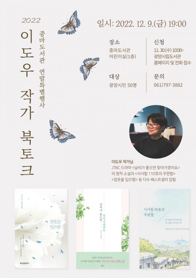¡®À̵µ¿ì ÀÛ°¡ ºÏ ÅäÅ©¡¯´Â ±¤¾ç½Ã¸³µµ¼°ü ȨÆäÀÌÁö(lib.gwangyang.go.kr)¿Í ÀüÈ Á¢¼ö¸¦ ÅëÇØ ½ÅûÇÒ ¼ö ÀÖÀ¸¸ç ±âŸ ±Ã±ÝÇÑ »çÇ×Àº ÀüÈ(¢Ï061-797-3882)·Î ¹®ÀÇÇϸé ÀÚ¼¼È÷ ¾Ë ¼ö ÀÖ´Ù.