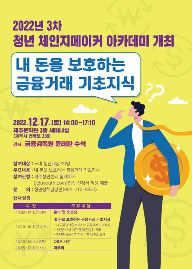°ÇÀüÇÑ ±ÝÀ¶°Å·¡ ¹× ÀÚ»ê°ü¸®¿¡ ´ëÇØ ¾Ë¾Æº¼ ¼ö ÀÖ´Â ÇöÀå °¿¬ Âü¼®ÀÚ 40¸íÀ» ¸ðÁýÇÑ´Ù. °¿¬¿¡ Á÷Á¢ Âü°¡ÇÏ°í ½ÍÀº û³âÀº 16ÀϱîÁö Á¦ÁÖû³â¼¾ÅÍ ´©¸®Áý(https://jejuyouth.com)À» ÅëÇØ ½ÅûÇÏ¸é µÈ´Ù.