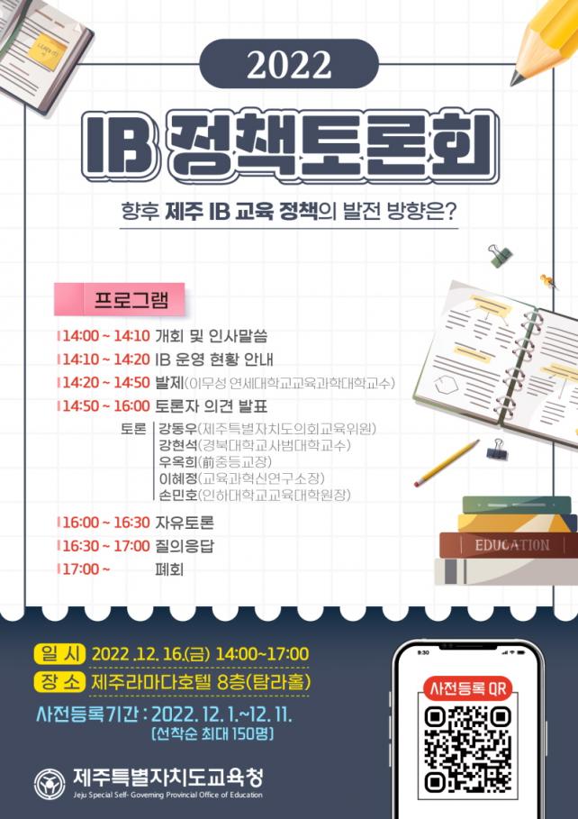 [½Ã»çÁ¾ÇսŹ® = °í¼º¹Î ±âÀÚ] Á¦ÁÖÆ¯º°ÀÚÄ¡µµ±³À°Ã»(±³À°°¨ ±è±¤¼ö)Àº¡®ÇâÈÄ Á¦ÁÖ IB ±³À° Á¤Ã¥ÀÇ ¹ßÀü ¹æÇ⡯À» ÁÖÁ¦·Î¡®2022 IB Á¤Ã¥Åä·Ðȸ(ÀÌÇÏ Åä·Ðȸ)¡¯¸¦ 12¿ù 16ÀÏ(±Ý) ¿ÀÈÄ 2½Ã ¶ó¸¶´ÙÇÁ¶óÀÚÁ¦ÁÖÈ£ÅÚ 8Ãþ ޶óȦ¿¡¼­ °³ÃÖÇÑ´Ù.