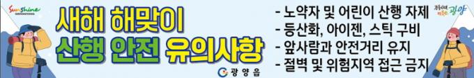 ÇÑÆí, ±¤¾çÀ¾Àº »õÇØ ÇØ¸ÂÀÌ »êÇà °£ ¾ÈÀü»ç°í À¯ÀÇ»çÇ× ¾È³» Çö¼ö¸·À» ¼»ê, ¸¶·Î»ê¼º µî»ê·Î µî 8°³¼Ò¿¡ °Ô÷Çϰí ÁÖ¿ä À§ÇèÁö¿ª¿¡ ¾ÈÀü¶óÀÎÀ» ¼³Ä¡ÇÏ´Â µî ¹ü½Ã¹Î È«º¸¿¡ ÁýÁßÇϰí ÀÖÀ¸¸ç, ¸¶À»¹æ¼Û°ú ±¤¾çÀ¾ īī¿Àä³Î ¡®Çູ 1¹øÁö »ì±â ÁÁÀº ±¤¾çÀ¾!¡¯À» ÅëÇØ Ãß°¡·Î ¾È³»Çϰí ÀÖ´Ù.