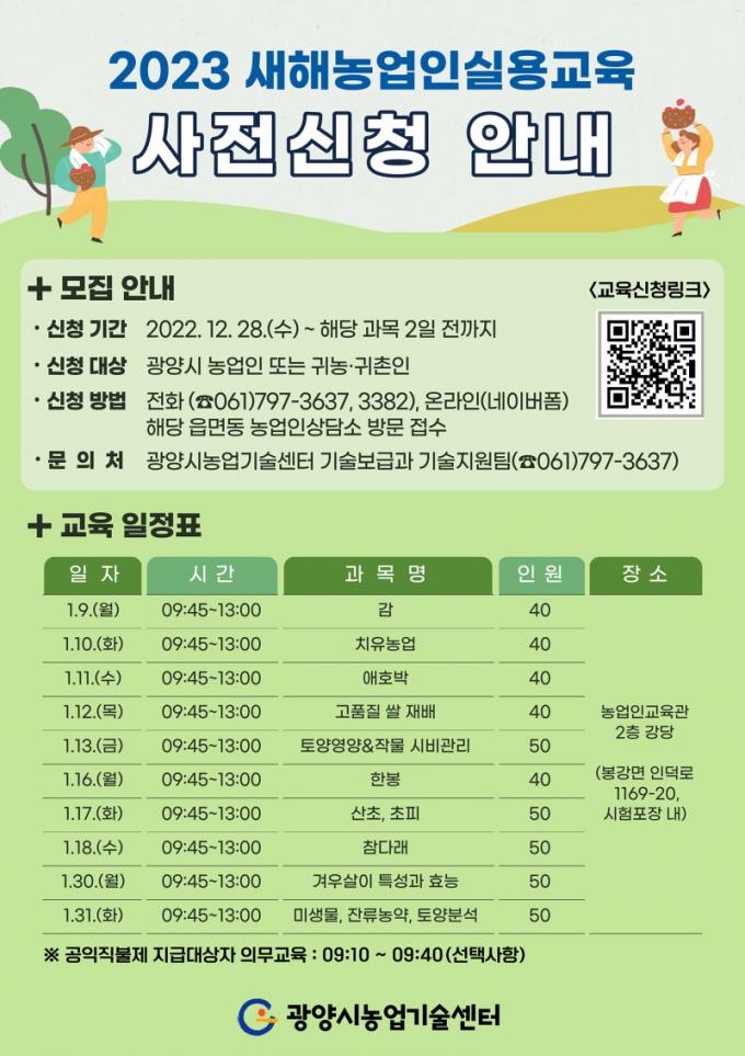 À̹ø ±³À°Àº ³»³â 1¿ù 9~31ÀÏ ±¤¾ç½Ã³ó¾÷Àα³À°°ü¿¡¼ °¨, Âü´Ù·¡, ¾ÖÈ£¹Ú µî 10°³ ǰ¸ñÀÇ Àü¹®°úÁ¤À» ÃßÁøÇϰí, ±³À° ½ÃÀÛ Àü °øÀÍÁ÷ºÒÁ¦ Àǹ«±³À°À» ½Ç½ÃÇÔÀ¸·Î½á Áö±Þ´ë»ó ³ó¾÷Àο¡ ´ëÇÑ ±³À°À» º´ÇàÇÒ °èȹÀÌ´Ù.