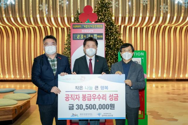 [½Ã»çÁ¾ÇսŹ® = °í¼º¹Î ±âÀÚ] Á¦ÁÖÆ¯º°ÀÚÄ¡µµ¿Í Á¦ÁÖÆ¯º°ÀÚÄ¡µµ°ø¹«¿ø³ëµ¿Á¶ÇÕÀº ¿ÃÇØ·Î 11³â°¸¦ ¸Â´Â ºÀ±Þ¿ì¼ö¸® ¸ð±Ý Áö¿ø »ç¾÷À» ÅëÇØ µµ³» ¾î·Á¿î ÀÌ¿ôÀ» À§ÇÑ ¡®Èñ¸Á ³ª´®¡¯ ¹®È­¸¦ ½ÇõÇß´Ù. ¿À¿µÈÆ Áö»ç´Â 29ÀÏ ¿ÀÈÄ 4½Ã Á¦ÁÖµµÃ» º»°ü ·Îºñ¿¡ ¼³Ä¡µÈ »ç¶ûÀÇ ¿Âµµ°è ¾Õ¿¡¼­ ¿ÀÅ层 Á¦ÁÖµµ °ø¹«¿ø³ëµ¿Á¶ÇÕ À§¿øÀå°ú ÇÔ²² ºÀ±Þ¿ì¼ö¸® ¸ð±ÝÀ¸·Î ¸¶·ÃµÈ ¼º±Ý 3,050¸¸ ¿øÀ» Á¦ÁÖµµ »çȸº¹Áö°øµ¿¸ð±Ýȸ(ȸÀå °­Áö¾ð)¿¡ Àü´ÞÇß´Ù. ºÀ±Þ¿ì¼ö¸® ¸ð±Ý Áö¿ø»ç¾÷Àº Á¦ÁÖµµ °ø¹«¿ø³ëµ¿Á¶ÇÕÀÇ Á¦¾ÈÀ¸·Î 2012³â 4¿ùºÎÅÍ ½ÃÀ۵ƴÙ. Á¦ÁÖµµ ¼Ò¼Ó °øÁ÷ÀÚµéÀÇ ¿ù±Þ Áß 1,000¿ø ¹Ì¸¸ÀÇ ¿ì¼ö¸®¿Í Èñ¸ÁÀÚ¿¡ ÇÑÇØ 5,000¿ø À̳» ±Ý¾×À» ¸ð¾Æ Á¦ÁÖÁö¿ªÀÇ ¾î·Á¿î ½Ã¼³°ú ÀÌ¿ô¿¡°Ô ±âºÎÇϰí ÀÖÀ¸¸ç, ÇöÀç µµ ¼Ò¼Ó °øÁ÷ÀÚ 90% ÀÌ»óÀÌ ºÀ±Þ¿ì¼ö¸® ¸ð±Ý¿¡ Âü¿©Çϰí ÀÖ´Ù. ¿ÃÇØ Áö¿ø´ë»óÀº º¹ÁöºÎ¼­ ¹× À¾¸éµ¿¿¡¼­ ÃßõÇÑ »çȸº¹Áö½Ã¼³ 12°³¼Ò¿Í µ¶°Å³ëÀÎ, ¼Ò³â¼Ò³à°¡Àå, ´Ù¹®È­°¡Á¤ µî 37°¡±¸À̸ç, Áö¿ø ±Ý¾×Àº 3,050¸¸ ¿øÀÌ´Ù. ÇÑÆí, ¿À¿µÈÆ Áö»ç´Â ¡°Äڷγª19 ÆÒµ¥¹ÍÀ¸·Î Èûµé¾ú´ø ÀÏ»óÀÌ Á¶±Ý¾¿ ȸº¹µÇ°í ÀÖÁö¸¸, ¾ÆÁ÷ ¿ÂÁ¤ÀÇ ¼Õ±æÀÌ ÇÊ¿äÇÑ °÷ÀÌ ¸¹´Ù¡±¸é¼­ ¡°°øÁ÷ÀÚ ºÀ±Þ¿ì¼ö¸® ¸ð±ÝÀÌ µµ¿òÀÇ ¼Õ±æÀ» ÇÊ¿ä·Î ÇÏ´Â ºÐµé¿¡°Ô ´õ ¸¹ÀÌ Àü´ÞµÉ ¼ö ÀÖµµ·Ï ³ë·ÂÇØ ´Þ¶ó¡±°í ´çºÎÇß´Ù. °­Áö¾ð ȸÀåÀº ¡°°ø¹«¿ø ¿©·¯ºÐ²²¼­ ¸Å´Þ ¸ð¾ÆÁֽЏð±Ý¾×Àº Áö¿ª»çȸ º¹Áö »ç°¢Áö´ë¿¡ ³õÀÎ ºÐµéÀ» À§ÇØ ¼ÒÁßÈ÷ »ç¿ëÇϰڴ١±°í ¸»Çß´Ù. ÇÑÆí, Á¦ÁÖµµ¿Í µµ °ø¹«¿ø³ëµ¿Á¶ÇÕÀº Áö³­ÇرîÁö ÃÑ 2¾ï 8,200¿©¸¸ ¿øÀ» ¸ð±ÝÇØ 102°³ ½Ã¼³¡¤249°¡±¸¸¦ Áö¿øÇÑ ¹Ù ÀÖ´Ù. Á¦ÁÖµµ¿Í °ø¹«¿ø³ëµ¿Á¶ÇÕÀº ³ë»ç°¡ ÇÔ²² ½ÇõÇÏ´Â Èñ¸Á ³ª´® ¹®È­¸¦ ´õ¿í È®»ê½Ã۰í, ³ë»çÇù·Â »ç¾÷À¸·Î ºÀ±Þ¿ì¼ö¸® ¸ð±Ý Áö¿ø »ç¾÷À» Áö¼ÓÀûÀ¸·Î À̾°¥ ¹æÄ§ÀÌ´Ù.