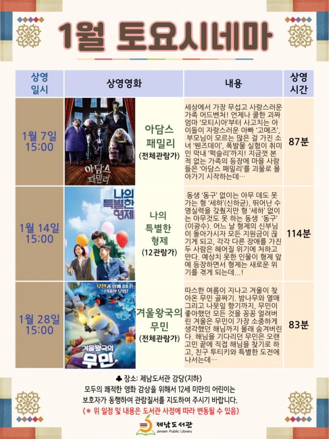 ¢º¡®³ªÀÇ Æ¯º°ÇÑ ÇüÁ¦¡¯ (1¿ù 14ÀÏ) µ¿»ý¡®µ¿±¸¡¯¾øÀÌ´Â ¾Æ¹« µ¥µµ ¸ø °¡´Â Çü¡®¼¼ÇÏ¡¯(½ÅÇϱÕ), ¶Ù¾î³ ¼ö¿µ½Ç·ÂÀ» °®ÃèÁö¸¸ Çü¾øÀÌ´Â ¾Æ¹«°Íµµ ¸ø ÇÏ´Â µ¿»ý¡®µ¿±¸¡¯(À̱¤¼ö). ¾î´À ³¯ ÇüÁ¦ÀÇ ½ÅºÎ´ÔÀÌ µ¹¾Æ°¡½ÃÀÚ ¸ðµç Áö¿ø±ÝÀÌ ²÷±â°Ô µÇ°í, µÎ »ç¶÷Àº Çì¾îÁú À§±â¿¡ óÇÏ°í ¸¸´Ù. ¿¹»óÄ¡ ¸øÇÑ Àι°ÀÌ ÇüÁ¦ ¾Õ¿¡ µîÀåÇÏ¸é¼ ÇüÁ¦´Â »õ·Î¿î À§±â¸¦ °Þ°Ô µÇ´Âµ¥...! ¢º¡®°Ü¿ï¿Õ±¹ÀÇ ¹«¹Î¡¯ (1¿ù 28ÀÏ) µû½ºÇÑ ¿©¸§ÀÌ Áö³ª°í °Ü¿ïÀÌ Ã£¾Æ¿Â ¹«¹Î °ñÂ¥±â. ¹«¹ÎÀÌ ÁÁ¾ÆÇß´ø ¸ðµç °ÍÀ» ²Ç²Ç ¾ó·Á¹ö¸° °Ü¿ïÀº ¹«¹ÎÀÌ °¡Àå ¼ÒÁßÇÏ°Ô »ý°¢Çß´ø ÇØ´Ô±îÁö ¸ô·¡ ¼û°Ü¹ö¸°´Ù. ÇØ´ÔÀ» ±â´Ù¸®´ø ¹«¹ÎÀº ¿À·£ °í¹Î ³¡¿¡ Á÷Á¢ ÇØ´ÔÀ» ã±â·Î Çϰí, Ä£±¸ ÅõƼŰ¿Í Ưº°ÇÑ µµÀü¿¡ ³ª¼´Âµ¥¡¦ ÇÑÆí, ¼±Á¤µÈ ¿µÈ´Â ¸ÅÁÖ Åä¿äÀÏ ¿ÀÈÄ 3½Ã µµ¼°ü °´ç¿¡¼ ¹«·á »ó¿µµÇ¸ç, ÀÚ¼¼ÇÑ ÀÏÁ¤Àº ºÙÀÓÀÚ·á ¹× È¨ÆäÀÌÁö(http://www.jnlib.go.kr)¸¦ Âü°íÇϰųª ÀüÈ(T.766-4600)·Î ¹®ÀÇÇÏ¸é µÈ´Ù.