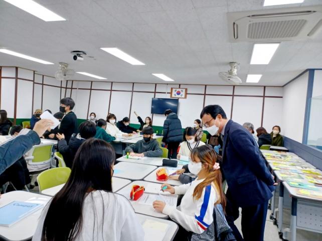 ÇÑÆí, Á¤¼ºÁß Á¦ÁÖ±¹Á¦±³À°¿øÀåÀº¡°2023³â »õÇØÀÇ Ã¹ ÁÖ¸¦ ¿Ü±¹¾îµè±â´É·Â½ÅÀå µ¿¾Æ¸® Ȱµ¿¿¡ ´ëÇÑ Çлýµé°ú Çкθð´ÔµéÀÇ ¶ß°Å¿î ¿­Á¤À¸·Î ²Ë ä¿ì´Â °Í °°¾Æ ¹«Ã´ Àǹ̰¡ ±í´Ù. »õ·Î¿î Ãâ¹ßÀ» ÇÏ´Â ¿¹ºñ ÁßÇлýµéÀÌ ¾ÕÀ¸·Î ²ÙÁØÈ÷ ¿µ¾î Àбâ Ȱµ¿À» ÅëÇØ ¿µ¾î ÀÇ»ç¼ÒÅë´É·ÂÀ» ±â¸£°í ´õ ³ÐÀº ¼¼°è·Î ³ª¾Æ°¡±â¸¦ ¹Ù¶õ´Ù¡±¶ó°í ¹àÇû´Ù.