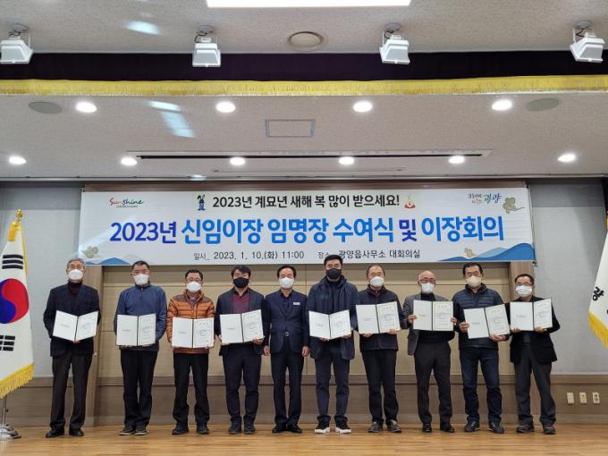 ±èÁ¾È£ ±¤¾çÀ¾ÀåÀº ¡°2023³â ÀÓ¸íµÈ ½Å±Ô ÀÌÀå´ÔµéÀÇ ÃëÀÓÀ» ÃàÇϵ帮¸ç, ÇàÁ¤°ú ÁֹΠ°£ °¡±³ ¿ªÇÒÀ» ¿øÈ°ÇÏ°Ô ¼öÇàÇØ Áֽðí, ÀÌÀå´ÔµéÀÌ ½Ã¡¤À¾Á¤¿¡ ´ëÇÑ Àû±ØÀûÀÎ ÇùÁ¶¿Í À¾¹Î º¹Áö Çâ»óÀ» À§ÇØ ³ë·ÂÇØ ÁÖ½Ã±æ ºÎŹµå¸°´Ù¡±°í ¸»Çß´Ù. ÀÌ¾î ¡°¾ÕÀ¸·Î 2023³â ±¤¾çÀ¾ ¹ßÀüÀ» À§ÇØ µµ¾àÇÏ´Â ÇØ°¡ µÉ ¼ö ÀÖµµ·Ï ÀÌÀå´Ôµé²²¼ ÇÔ²² Èû½á ÁÖ½Ã±æ ¹Ù¶õ´Ù¡±°í µ¡ºÙ¿´´Ù.