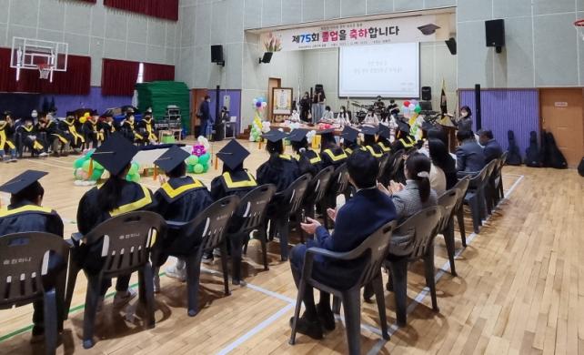 Á¹¾÷»ýµéÀº ±³Àå ¼±»ý´Ô°ú Çб³ ³»¿Ü °ü°èÀÚµéÀÇ ÃàÇÏ Àλ縦 ÅëÇØ Á¹¾÷ÀÇ Àǹ̸¦ ¸¶À½¿¡ ´ã¾Ò°í Á¹¾÷»ýÀ» ´ëÇ¥ÇÏ¿© ¿À½ÂÈÆ Àü±³¾î¸°ÀÌȸÀåÀÌ Á¹¾÷»ç¸¦ ÇÏ¿´´Ù. ¸¶Áö¸·À¸·Î Á¹¾÷»ý ÀÚÃà °ø¿¬À¸·Î 1³â µ¿¾È ¿¬½ÀÇÑ ±âŸ ¿¬ÁÖ¿Í Á¹¾÷°¡¸¦ ÇÔ²² ºÎ¸£¸ç Á¤µé¾ú´ø Çб³¸¦ ¶°³ª´Â ¸¶À½À» ÀüÇß´Ù.