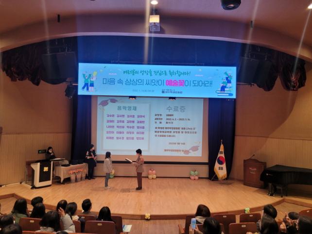 ¼ö·á½Ä¿¡ ¾Õ¼¡®¾Æ¸§´Ù¿òÀ» º¸´Â ´«¡¯À̶ó´Â ÁÖÁ¦·Î ¼±ÍÆ÷½Ã±³À°Áö¿øÃ» ±³¼öÇнÀÁö¿ø°ú ¹ÚÀçÈñ °úÀåÀÇ¡®ÀÛÀº ¿¹¼ú°¡·Î¼ ÀÚ½ÅÀ» ¼ºÀå½ÃŰ´Â ³× °¡Áö ¹æ¹ý¡¯¿¡ °üÇÑ Æ¯°ÀÌ ÀÖ¾úÀ¸¸ç, À̾îÁø ¼ö·á½Ä¿¡¼´Â ÃʵîÀ½¾Ç 20¸í, Ãʵî¹Ì¼ú 18¸í ÃÑ 38¸íÀÇ Çлýµé¿¡°Ô ¼ö·áÁõÀÌ ¼ö¿©µÇ¾ú´Ù.