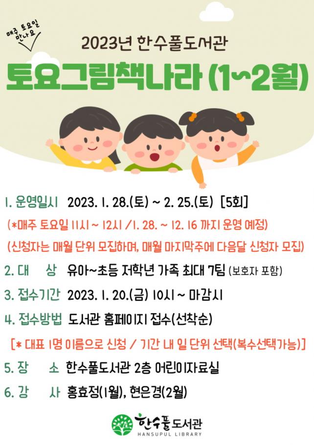 À̹ø °Á´ 1¿ù 28ÀϺÎÅÍ 2¿ù 25ÀϱîÁö ¸ÅÁÖ Åä¿äÀÏ 11½Ã - 12½Ã¿¡ ÁøÇàµÇ¸ç ȨÆäÀÌÁö¸¦ ÅëÇØ ¿ù ´ÜÀ§·Î Âü°¡ÀÚ¸¦ ¸ðÁýÇÏ¿© ÇѼöÇ®µµ¼°ü 2Ãþ ¾î¸°ÀÌÀÚ·á½Ç¿¡¼ ÁøÇàÇÏ°Ô µÈ´Ù.