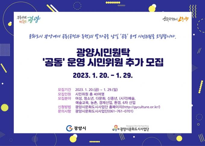°øµ¿ À§¿ø ¸ðÁý°ú °ü·ÃµÈ ÀÚ¼¼ÇÑ ³»¿ëÀº ±¤¾ç½Ãû, ±¤¾ç½Ã¹®Èµµ½Ã»ç¾÷´Ü ȨÆäÀÌÁö¿¡¼ È®ÀÎÇÒ ¼ö ÀÖÀ¸¸ç, ½Åû¼´Â À̸ÞÀÏ(gycc2022@hanmail.net)·Î Á¦Ãâ °¡´ÉÇÏ´Ù.
