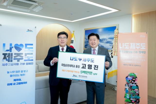 Á¦ÁÖÆ¯º°ÀÚÄ¡µµ´Â Á¦ÁÖ Ãâ½ÅÀÎ °í¿µÁø ±¹¸³¼øÃµ´ëÇб³ ÃÑÀåÀÌ °íÇâ»ç¶û±âºÎ±Ý 500¸¸ ¿øÀ» Àü´ÞÇß´Ù°í ¹àÇû´Ù.