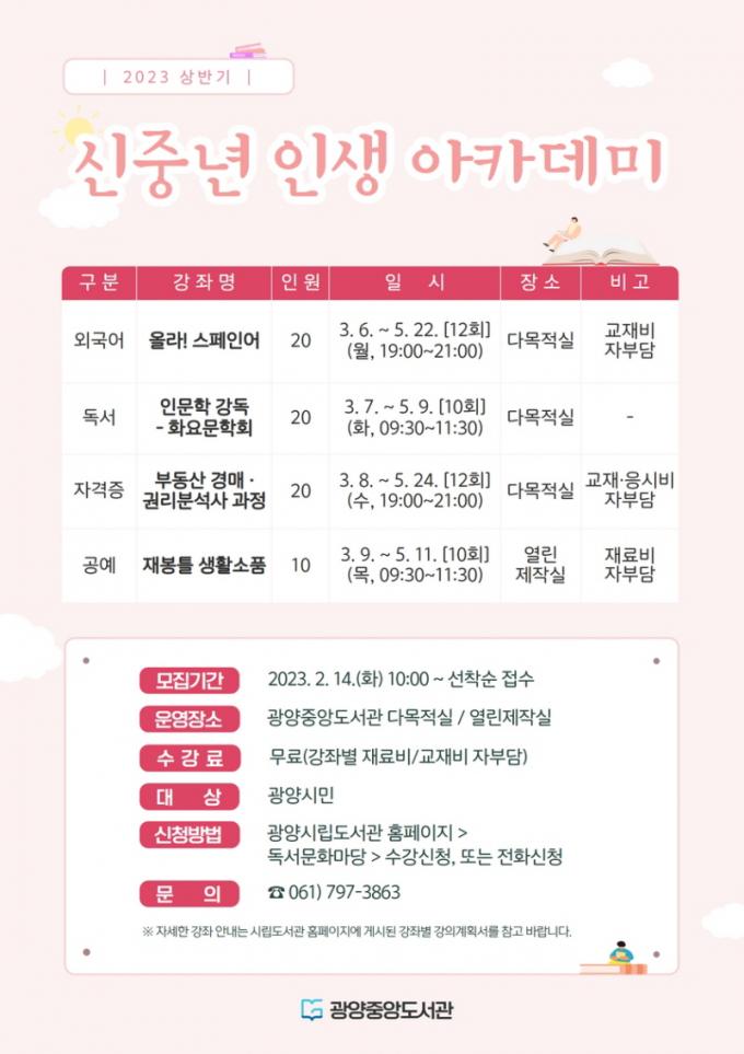 ±¤¾ç½Ã¿¡ °ÅÁÖÇÏ´Â ½ÅÁß³âÀ» ´ë»óÀ¸·Î ¿À´Â 3¿ù 6ÀϺÎÅÍ 5¿ù 24ÀϱîÁö ¡ã¿Ã¶ó! ½ºÆäÀÎ¾î ¡ãÀι®ÇÐ °µ¶-ȿ乮ÇÐȸ ¡ãºÎµ¿»ê °æ¸Å¡¤±Ç¸®ºÐ¼®»ç °úÁ¤ ¡ãÀçºÀƲ »ýȰ¼Òǰ µî ¸ðµÎ 4°³ °Á¸¦ ¿î¿µÇÑ´Ù. Æò¼Ò µµ¼°ü ÀÌ¿ëÀÌ ¾î·Á¿î Á÷ÀåÀÎÀ» À§ÇØ ¾ß°£ °Áµµ ÁøÇàÇÑ´Ù.