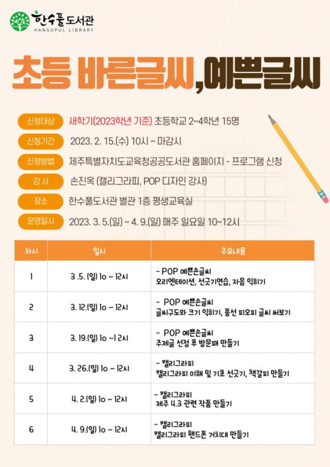 »õÇбâ(2023Çг⠱âÁØ) ÃʵîÇб³ 2~4Çгâ 15¸íÀ» ´ë»óÀ¸·Î ¼ÕÁø¿Á(͏®±×¶óÇÇ, POP µðÀÚÀÎ °»ç) ¼±»ý´Ô°ú POP ¿¹»Û¼Õ±Û¾¾¾²±â, ͏®±×¶óÇǸ¦ Ȱ¿ëÇÑ Ã¥°¥ÇÇ ¸¸µé±â, ¹«µåµî ¸¸µé±â µî ´Ù¾çÇÑ ±Û¾¾¾²±â Ȱµ¿À» ÁøÇàÇÒ ¿¹Á¤ÀÌ´Ù.