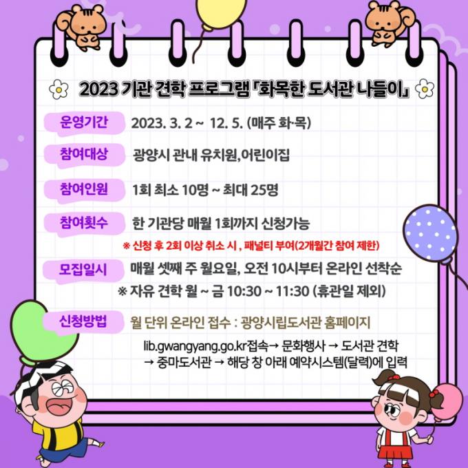 Áö³ÇØ´Â 9¿ùºÎÅÍ 12¿ù±îÁö 4°³¿ù µ¿¾È ÃÑ 35ȸ 531¿© ¸íÀÇ ¾î¸°À̰¡ ÀÌ ÇÁ·Î±×·¥¿¡ Âü¿©Çß°í, ¿¬·Éº° ¸ÂÃãÇü ÇÁ·Î±×·¥ ÁøÇàÀ¸·Î ¸¹Àº È£ÀÀÀ» ¾ò¾ú´Ù. ¿ÃÇØ´Â ¿À´Â 3¿ù 2ÀϺÎÅÍ 12¿ù 5ÀϱîÁö ¿î¿µµÇ¸ç, ¹æÇÐ ±â°£ÀÎ 7, 8¿ùÀ» Á¦¿ÜÇÑ ¸ÅÁÖ È¡¤¸ñ(2ȸ) ¿ÀÀü 10½Ã 30ºÐºÎÅÍ 11½Ã 30ºÐ±îÁö 1½Ã°£ µ¿¾È ÁøÇàµÈ´Ù.