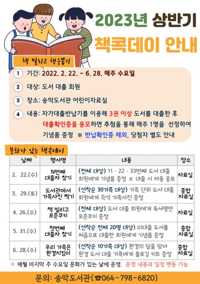 ÁÖ¿ä Çà»ç·Î´Â ÀÚ°¡´ëÃâ¹Ý³³±â¸¦ ÀÌ¿ëÇÏ¿© 3±Ç ÀÌ»óÀÇ µµ¼¸¦ ´ëÃâÇÑ ÈÄ ´ëÃâÈ®ÀÎÁõÀ» ÀÀ¸ðÇϸé Ãß÷À» ÅëÇØ ±â³äǰÀ» ÁõÁ¤Çϴ¡®Ã¥ ºô¸®°í Çà¿î »Ì±â¡¯¸¦ ¿À´Â 22ÀÏ(¼ö)ºÎÅÍ 6¿ù 28ÀÏ(¼ö)±îÁö ¸ÅÁÖ ¼ö¿äÀϸ¶´Ù ¾î¸°ÀÌ ÀÚ·á½Ç¿¡¼ ¿î¿µÇÑ´Ù.