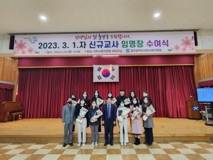 ¼ö¿©½ÄÀº ¡ãÀÓ¸íÀå Àü´Þ ¡ã½Å±Ô ±³»çµéÀÇ ±³Á÷»ýȰ ù Ãâ¹ßÀ» ÃàÇÏÇÏ´Â ²É Àü´Þ ¡ã±³À°°ø¹«¿øÀ¸·Î¼ ÀÓ¹«¸¦ ¼º½ÇÈ÷ ¼öÇàÇÒ °ÍÀ» ´ÙÁüÇÏ´Â ¼±¼ ¡ã ±èÁ¦¾È ±³À°Àå ÃàÇÏÀÎ»ç ¡ã±â³ä ÃÔ¿µ µîÀÇ ¼øÀ¸·Î ÁøÇàµÆ´Ù. ÇÑÆí, ±¤ÁÖ¼ºÎ±³À°Áö¿øÃ» ±èÁ¦¾È ±³À°ÀåÀº ÀÓ¸íÀå ¼ö¿©½Ä¿¡¼ ¡°±³À°°ø¹«¿øÀ¸·Î¼ÀÇ Ã¹ Ãâ¹ßÀ» Áø½ÉÀ¸·Î ÃàÇÏÇÑ´Ù¡±¸ç ¡°±¤ÁÖ±³À°ÀÇ ¹Ì·¡¸¦ À̲ø¾î°¥ ¼±»ý´ÔµéÀÇ ¿Á¤ÀÌ ±³À° ÇöÀå¿¡¼ Ȱ¦ ²ÉÇÇ¿ï ¼ö Àֱ⸦ ¹Ù¶õ´Ù¡±°í ¹àÇû´Ù.