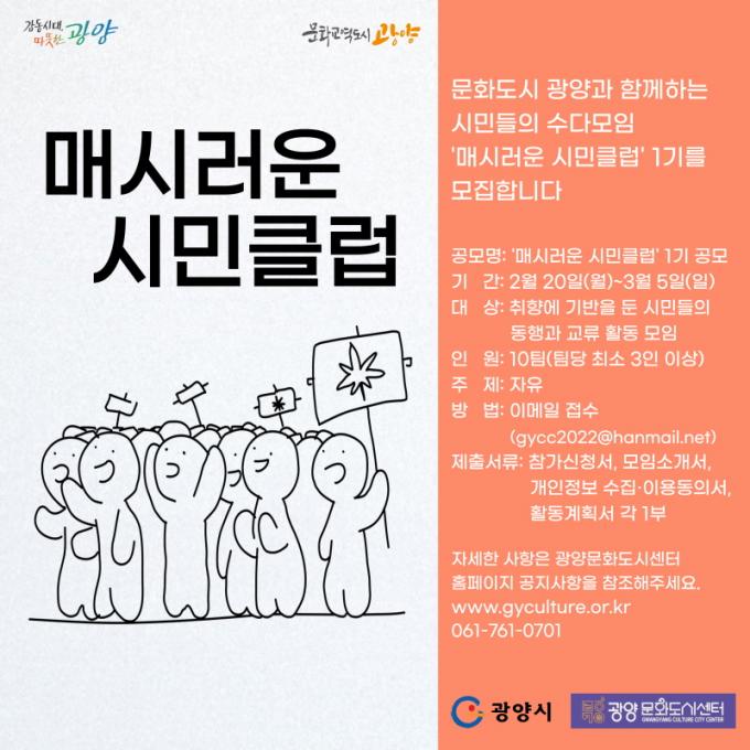 ¡®¸Å½Ã·¯¿î ½Ã¹ÎŬ·´¡¯Àº ±¤¾ç½Ã ¹®Èµµ½Ã ¿¹ºñ»ç¾÷ÀÇ ÀÏȯÀ¸·Î ¹®È¸¦ ¸Å°³·Î ÇÑ ½Ã¹ÎµéÀÇ ÀÏ»ó ¼Ó µ¿Çà°ú ±³·ùÀÇ ½Çõ¿¡ ÁÖ¸ñÇÑ´Ù.