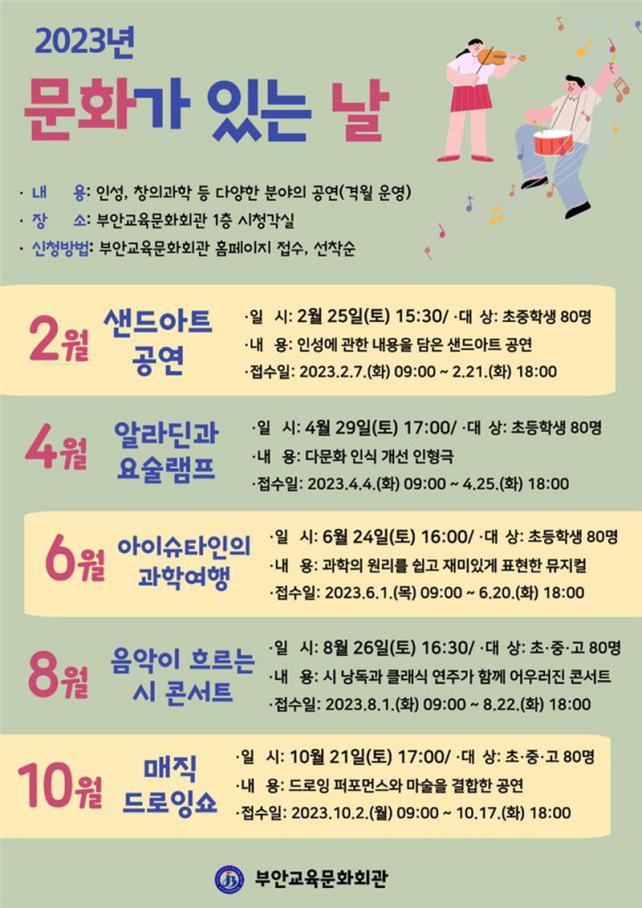 ¡¸¹®È°¡ ÀÖ´Â ³¯¡¹Àº ºÎ¾È Áö¿ª ÇлýµéÀÇ ÀÏ»ó ¼Ó ¹®È ÇâÀ¯±ÇÀ» È®´ëÇϰí, ¹®È ¿¹¼úÀû °¨¼ö¼º ¹× âÀǼºÀ» ½ÅÀå½Ã۰íÀÚ ½Å¼³µÈ Á¤±âÀû ¹®È °ø¿¬ ÇÁ·Î±×·¥ÀÌ´Ù.