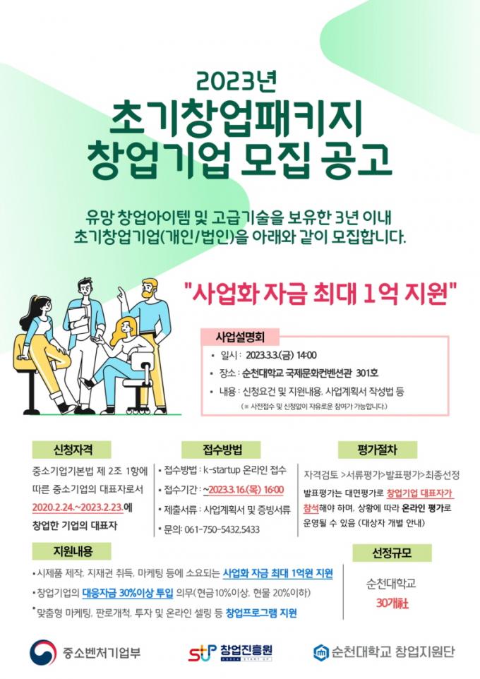 ÇÑÆí ¼øÃµ´ëÇб³¿¡¼´Â 2023³â Ãʱââ¾÷ÆÐŰÁö »ç¾÷¿¡ Âü¿©ÇÒ Ã¢¾÷±â¾÷À» ¸ðÁýÇϰí ÀÖÀ¸¸ç, Á¢¼ö ±â°£Àº ¿À´Â 3¿ù 16ÀÏ 16½Ã±îÁöÀÌ´Ù.