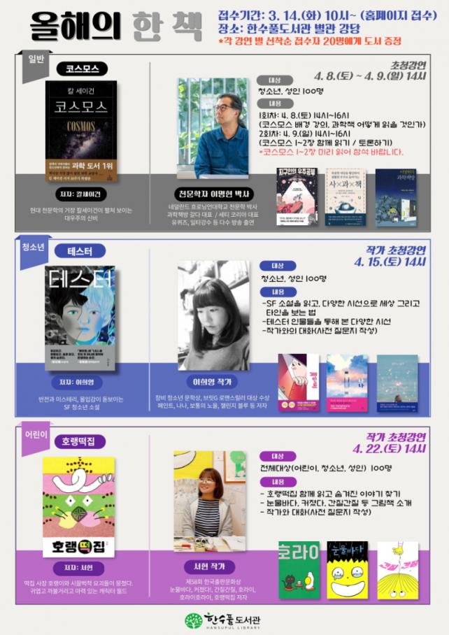 [½Ã»çÁ¾ÇսŹ® = °í¼º¹Î ±âÀÚ] ÇѼöÇ®µµ¼­°üÀº Áö¿ªÁÖ¹ÎÀÇ µ¶¼­ »ýȰȭ¿Í Ã¥ Àд ¹®È­ Á¶¼ºÀ» À§ÇÏ¿©¡®2023³â ¿ÃÇØÀÇ ÇÑ Ã¥ – ÀÛ°¡ ÃÊû °­¿¬¡¯Âü°¡ÀÚ¸¦ ¸ðÁýÇÑ´Ù. ¡®2023³â ¿ÃÇØÀÇ ÇÑ Ã¥¡¯Àº µµ¼­°ü¿¡¼­ ÇÑ ÇØ µ¿¾È Áö¿ªÁֹεé°ú ÇÔ²² ÀÐÀ» Ã¥À» ¼±Á¤ÇÏ¿© µµ¼­ Àü½Ã ¹× ÀÛ°¡ ÃÊû °­¿¬À» ÁøÇàÇÏ´Â µ¶¼­¹®È­ÇÁ·Î±×·¥À¸·Î, ¼±Á¤µÈ Ã¥Àº ¡ãÀÏ¹Ý ºÎ¹®, ¡¸ÄÚ½º¸ð½º¡¹(Ä® ¼¼À̰Ç), ¡ãû¼Ò³â ºÎ¹® ¡¸Å×½ºÅÍ¡¹(ÀÌÈñ¿µ), ¡ã¾î¸°ÀÌ ºÎ¹® ¡¸È£·©¶±Áý¡¹(¼­Çö)ÀÌ´Ù. ÃÊû °­¿¬Àº 4¿ù 8ÀϺÎÅÍ 4¿ù 22ÀϱîÁö 4ȸÂ÷·Î ¿î¿µµÇ¸ç, ÀÏÁ¤ ¹× °­¿¬ ³»¿ëÀº ´ÙÀ½°ú °°´Ù. - 4¿ù 8ÀÏ~9ÀÏ, À̸íÇö õ¹®ÇÐ ¹Ú»ç,¡®ÄÚ½º¸ð½º¿Í Ä®¼¼À̰ǡ¯ - 4¿ù 15ÀÏ, ÀÌÈñ¿µ ÀÛ°¡, ¡®SF ¼Ò¼³À» ÀÐ°í ¼¼»ó ¹Ù¶óº¸±â¡¯ - 4¿ù 22ÀÏ, ¼­Çö ÀÛ°¡, ¡®È£·©¶±Áý ±íÀÌ Àб⡯ Âü°¡ÀÚ ¸ðÁýÀº ȸÂ÷º° 100¸í¾¿ ¾î¸°ÀÌ, û¼Ò³â, ¼ºÀÎ ´ë»óÀ¸·Î 3¿ù 14ÀÏ(È­) 10½ÃºÎÅÍ Á¦ÁÖÆ¯º°ÀÚÄ¡µµ±³À°Ã» °ø°øµµ¼­°ü ȨÆäÀÌÁö(org.jje.go.kr/lib)¸¦ ÅëÇØ ½Åû¹Þ´Â´Ù.