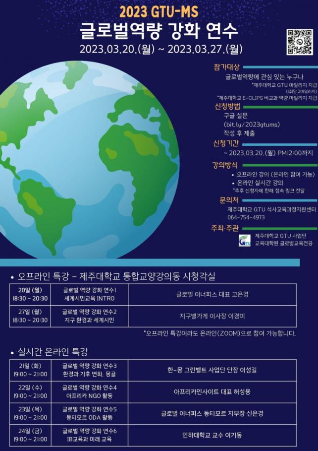 Á¦ÁÖ´ë ±Û·Î¹ú±³¿ø¾ç¼º°ÅÁ¡´ëÇлç¾÷´Ü ¼®»ç°øµ¿±³À°°úÁ¤Áö¿ø¼¾ÅÍ(¼¾ÅÍÀå ±Ç»óö)°¡ ÁÖ°üÇÏ´Â À̹ø ÇÁ·Î±×·¥Àº ±¹Á¦ Çù·Â ºñ¿µ¸® ¹Î°£´ÜüÀÎ ±Û·Î¹úÀ̳ÊÇǽº(´ëÇ¥ °íÀº°æ)¿Í Çù·ÂÇØ ¿î¿µµÇ¸ç, Á¦ÁÖ Áö¿ª (¿¹ºñ)±³¿øÀÇ ¼¼°è½Ã¹Î±³À°, Áö±¸ ȯ°æ ¹× ºó°ï À̽´, IB ±³À°°ú °ü·ÃµÈ Áö½ÄÀ» Çâ»óÀ» À§ÇÏ¿© ±âȹµÆ´Ù.