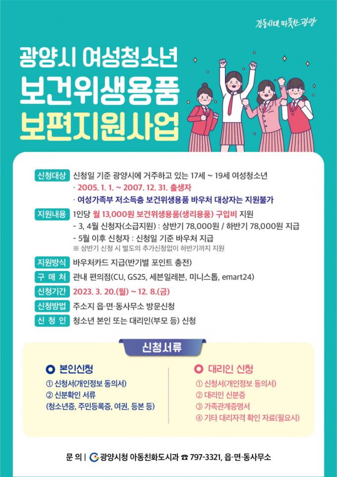 Áö¿ø ´ë»óÀº ±¤¾ç½Ã¿¡ °ÅÁÖÇÏ´Â 17¼¼~19¼¼(2005³â~2007³â Ãâ»ý) ¿©¼ºÃ»¼Ò³âÀ¸·Î ½Ã´Â »ç¾÷ºñ 3¾ï¿øÀ» ÅõÀÔÇØ ¾à 2,300¸íÀ» Áö¿øÇÒ ¿¹Á¤ÀÌ´Ù. ´Ù¸¸, ¿©¼º°¡Á·ºÎ Àú¼ÒµæÃþ ¿©¼ºÃ»¼Ò³â À§»ý¿ëǰ Áö¿ø»ç¾÷°ú Áߺ¹ ½ÅûÀº ºÒ°¡ÇÏ´Ù. Áö¿ø±Ý¾×Àº 1ÀÎ´ç ¿ù 1¸¸3õ¿ø(¿¬°£ ÃÖ´ë 15¸¸6õ¿ø)À¸·Î º¸°ÇÀ§»ý¿ëǰÀ» ±¸ÀÔÇÒ ¼ö ÀÖ´Â ¹Ù¿ìóīµå°¡ Áö±ÞµÇ¸ç Áö¿ª ³» ÆíÀÇÁ¡(CU, GS25, ¼¼ºìÀÏ·¹ºì, À̸¶Æ®24, ¹Ì´Ï½ºÅé)¿¡¼ ±¸¸Å °¡´ÉÇÏ´Ù.