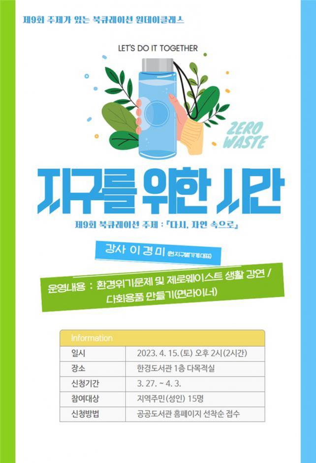 Ŭ·¡½º´Â ¼ºÀÎÀ» ´ë»óÀ¸·Î ÇѰ浵¼°ü 1Ãþ ´Ù¸ñÀû½Ç¿¡¼ 4¿ù 15ÀÏ Åä¿äÀÏ ¿ÀÈÄ 14:00ºÎÅÍ 2½Ã°£ µ¿¾È ÁøÇàµÈ´Ù. Âü¿©½ÅûÀº 3¿ù 27ÀÏ ¿ÀÀü 10½ÃºÎÅÍ 4¿ù 3ÀϱîÁöÀ̸ç, Á¦ÁÖ °ø°øµµ¼°ü ȨÆäÀÌÁö(www.jeju.go.kr/lib)¸¦ ÅëÇØ ¼±Âø¼ø 15¸í±îÁöÁ¢¼ö°¡ °¡´ÉÇÏ´Ù.