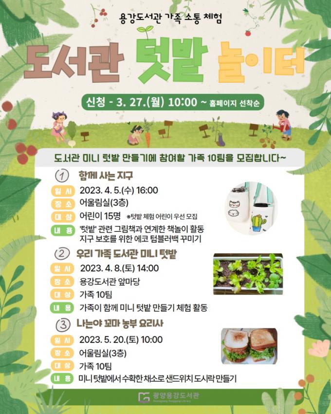 ÅÔ¹ç ¸¸µé±â´Â ¿Â °¡Á·ÀÌ Âü¿©ÇÒ ¼ö ÀÖ´Â ¿À´Â 4¿ù 8ÀÏ Åä¿äÀÏ¿¡ ÁøÇàÇÑ´Ù. ÅÔ¹ç ÀÛ¹°°ú ¾¾¾Ñ¿¡ ´ëÇØ ¹è¿ì°í Á÷Á¢ Ⱥп¡ ½É¾îº¸´Â üÇèÀ¸·Î ÁÖ¸»¸¶´Ù °¡Á·ÀÌ µµ¼°üÀ» ¹æ¹®ÇØ ¹°À» ÁÖ°í Ç®À» »Ì´Â µîÀÇ Áö¼ÓÀûÀÎ °ü¸® ¹æ¹ý±îÁö ½±°Ô ¾Ë·ÁÁÙ ¿¹Á¤ÀÌ´Ù.