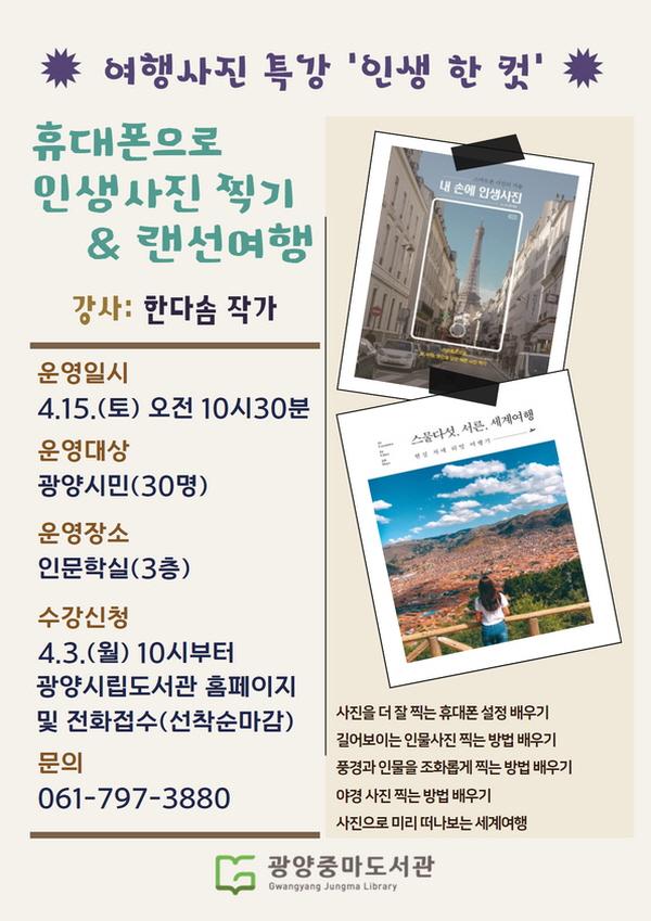 ¡®Àλý ÇÑ ÄÆ¡¯ °¿¬Àº ¿À´Â 4¿ù 3ÀÏ ¿ÀÀü 10½ÃºÎÅÍ ±¤¾ç½Ã¸³µµ¼°ü ȨÆäÀÌÁö¿Í ÀüÈ Á¢¼ö¸¦ ÅëÇØ ½ÅûÇÒ ¼ö ÀÖÀ¸¸ç, ±âŸ ±Ã±ÝÇÑ »çÇ×Àº ÀüÈ(¢Ï061-797-3880)·Î ¹®ÀÇÇϸé ÀÚ¼¼È÷ ¾Ë ¼ö ÀÖ´Ù.