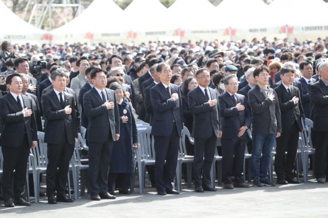 À̳¯ Ãß³ä½Ä¿¡´Â 4¡¤3 »ýÁ¸Èñ»ýÀÚ ¹× À¯Á·, Á¦ÁÖµµ¹Î, Á¤ºÎ ¹× Á¤´ç °ü°èÀÚ µî ÃÑ 1¸¸ ¿©¸íÀÌ Âü¼®ÇßÀ¸¸ç, ÁÖ¿ä ³»ºóÀÇ 50% ÀÌ»óÀÌ °í·É À¯Á·°ú »ýÁ¸Èñ»ýÀÚ Áß½ÉÀ¸·Î 4¡¤3Ãß³ä½ÄÀ» ´õ¿í ¶æ±í°Ô Çß´Ù. Á¤ºÎ ´ëÇ¥·Î ÇÑ´ö¼ö ±¹¹«ÃѸ®¿Í ÇÑâ¼· ÇàÁ¤¾ÈÀüºÎ Àå°ü Á÷¹«´ëÇà, ¿øÈñ·æ ±¹Åä±³ÅëºÎ Àå°ü, ¼ÛµÎȯ ±¹°¡ÀαÇÀ§¿øÀå µîÀÌ Âü¼®Çϰí, ±¹¹æºÎ´Â ±º¾Ç´ë¿Í ÀÇÀå´ë¸¦ ÅõÀÔÇØ ¾Ö±¹°¡ Á¦Ã¢, ÇåÈ¡¤ºÐÇâ µî Çà»ç¸¦ Áö¿øÇØ 4¡¤3 Èñ»ýÀڵ鿡°Ô ÃÖ´ëÇÑ ¿¹¿ì¸¦ °®Ãè´Ù.