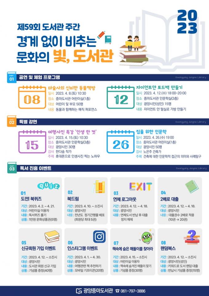 ±×¹Û¿¡ ¡¸¿øÀÛÀÌ ÀÖ´Â ¿µÈ¡¹¸¦ ÁÖÁ¦·Î ¸ÅÁÖ È¿äÀÏ ¿ÀÈÄ 2½Ã ¡ã ¡®ÇϷ硯 ¿µÈ ±ØÀå ¿î¿µ ¡ã¡®µµ¡¤¼¡¤°ü¡¯À¸·Î »ïÇà½Ã Áþ±â ¡ãÀüÀÚÃ¥ µ¶¼¿Õ ¼±¹ß ¡ãµ¶¼ °ø°¨-µ¶¼ÄûÁî ¡ã¡¸4¿ù¿£ Ã¥Àå ¼Ó Ã¥À» ²¨³» Àоî¿ä!¡¹ ÀνºÅ¸±×·¥ À̺¥Æ® ¡ã½Å±Ô ȸ¿ø°¡ÀÔ À̺¥Æ® ¡ãû¼Ò³âÀ» À§ÇÑ ¿øÈ Àü½Ã µî ´Ù¾çÇÑ À̺¥Æ®¸¦ ¿î¿µÇÑ´Ù. ¶ÇÇÑ, ¹«ÇÑÇÑ °¡´É¼ºÀ» °¡Áø »õ·Î¿î ¿¹ºñ ÀÛ°¡¸¦ ¹ß±¼Çϱâ À§ÇØ ±¤¾ç½Ã¹ÎÀ» ´ë»óÀ¸·Î ¿À´Â 28ÀϱîÁö 4¿ù ÇÑ ´Þ°£ ¡®±¤¾ç½Ã âÀ۽à °ø¸ðÀü¡¯À» °³ÃÖÇÑ´Ù. ❒ ±¤¾çÁ߸¶µµ¼°ü Á߸¶µµ¼°üÀº ¿À´Â 26ÀÏ ¿ù°£ Àι®ÇÐ ÇÁ·Î±×·¥ÀÇ ÀÏȯÀ¸·Î ÁøÇàµÇ´Â ¡¸ÁýÀ» À§ÇÑ Àι®ÇС¹°¿¬¿¡¼ °ÇÃà¿¡ ´ëÇÑ Àι®ÇÐÀû Á¢±ÙÀÇ ÀÇ¹Ì¿Í »ç·Ê¸¦ ޱ¸ÇÏ´Â ½Ã°£À» °®´Â´Ù. ¶ÇÇÑ, ¿À´Â 15ÀÏ¿¡´Â ÇÑ´Ù¼Ø »çÁøÀÛ°¡°¡ ÁøÇàÇÏ´Â ¡¸Àλý ÇÑ ÄÆ¡¹ °¿¬¿¡¼ Àü¹® Ä«¸Þ¶ó°¡ ¾ø´õ¶óµµ ÈÞ´ëÆùÀ¸·Î ¿©Çà Áß¿¡ Àλý »çÁøÀ» Âï´Â ³ëÇϿ츦 ÀüÇÒ ¿¹Á¤ÀÌ´Ù.