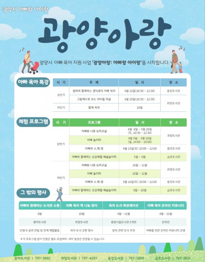 ¡®±¤¾ç¾Æ¶û¡¯Àº ¡®¾Æºü¶û ¾ÆÀ̶û¡¯ÀÇ ÁÙÀÓ¸»·Î ¾ÆÀÌ ¾çÀ°Çϱâ ÁÁÀº ȯ°æ Á¶¼ºÀ» À§ÇØ ¿¹ºñ ¶Ç´Â Ãʺ¸ ¾Æºü¸¦ À§ÇÑ ¾Æºü À°¾Æ °ü·Ã Çà»ç¿Í ÇÁ·Î±×·¥ µîÀ» Áö¿øÇÏ´Â »ç¾÷ÀÌ´Ù. ÀÌ »ç¾÷Àº ¸Â¹úÀÌ °¡Á¤ÀÇ Áõ°¡¿Í ¡®°øµ¿À°¾Æ¡¯ º¸ÆíÈ·Î ¾ÆºüµéÀÇ À°¾Æ Âü¿©°¡ ´Ã¾î³ª°í ÀÖÀ¸³ª ¾çÁúÀÇ ¾Æºü À°¾Æ Á¤º¸¸¦ ¾ò´Â µ¥ ¾î·Á¿òÀÌ Å« ¾çÀ°ÀÚ¿¡°Ô µµ¿òÀ» ÁÖ±â À§ÇØ ¸¶·ÃµÆ´Ù.