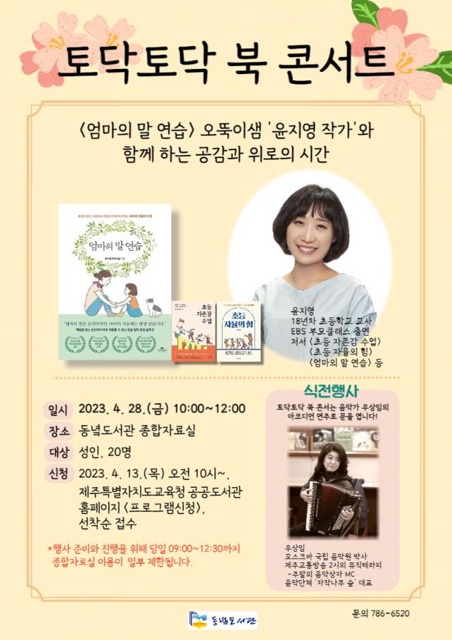 À̹ø ÇÁ·Î±×·¥Àº 4¿ù 28ÀÏ(±Ý) ¿ÀÀü 10½ÃºÎÅÍ µ¿³èµµ¼°ü Á¾ÇÕÀÚ·á½Ç¿¡¼ À½¾Ç°¡ ¿ì»óÀÓÀÇ ¾ÆÄÚµð¾ð ¿¬ÁÖ¸¦ ½ÃÀÛÀ¸·Î, <¾ö¸¶ÀÇ ¸» ¿¬½À>ÀÇ ÀúÀÚÀÎ ¿À¶ÒÀÌ»ù À±Áö¿µ ÀÛ°¡¿Í ÇÔ²² ¾ÆÀ̵é°úÀÇ ´ëȹý°ú À°¾Æ¿¡ ´ëÇÑ ¸¶À½°¡Áü µî¿¡ ´ëÇØ À̾߱âÇÏ´Â ½Ã°£À» °®´Â´Ù.