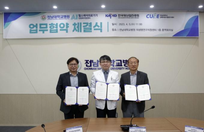 5ÀÏ Àü³²´ëÇб³º´¿ø ÀÇ»ý¸í¿¬±¸Áö¿ø¼¾ÅÍ 1Ãþ Áß¿ªÈ¸Àǽǿ¡¼ ÁøÇàµÈ Çù¾à½Ä¿¡´Â Àü³²´ëÇб³ »ýüÀÇ·á½ÃÇ迬±¸¼¾ÅÍ ¹Ú»ó¿ø ¼¾ÅÍÀå, Àü³²´ëÇб³º´¿ø AIÇコÄɾîÀÇ·á±â±â»ó¿ëÈÁö¿ø¼¾ÅÍ Á¶ÇüÈ£ ¼¾ÅÍÀå, Çѱ¹±¤»ê¾÷ÁøÈïȸ ±èµ¿±Ù »ó±ÙºÎȸÀåÀÌ Âü¼®Çß´Ù.